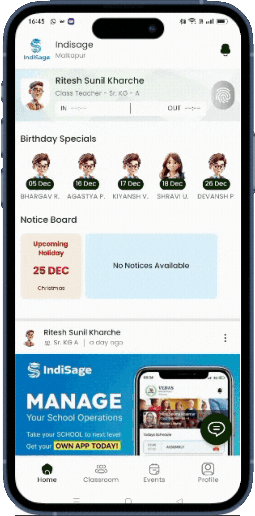 Enable seamless teacher attendance tracking directly from the home screen. With the “Mark In” and “Mark Out” options, teachers can record their arrival and departure times effortlessly. This feature ensures accurate attendance logging, supports efficient record-keeping, and promotes accountability, all while simplifying the daily workflow for educators.