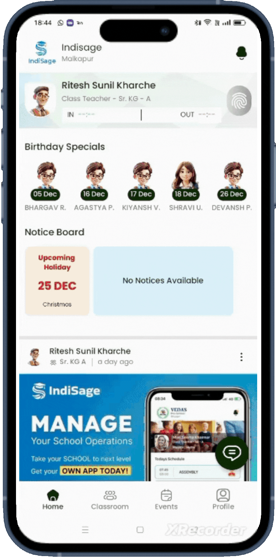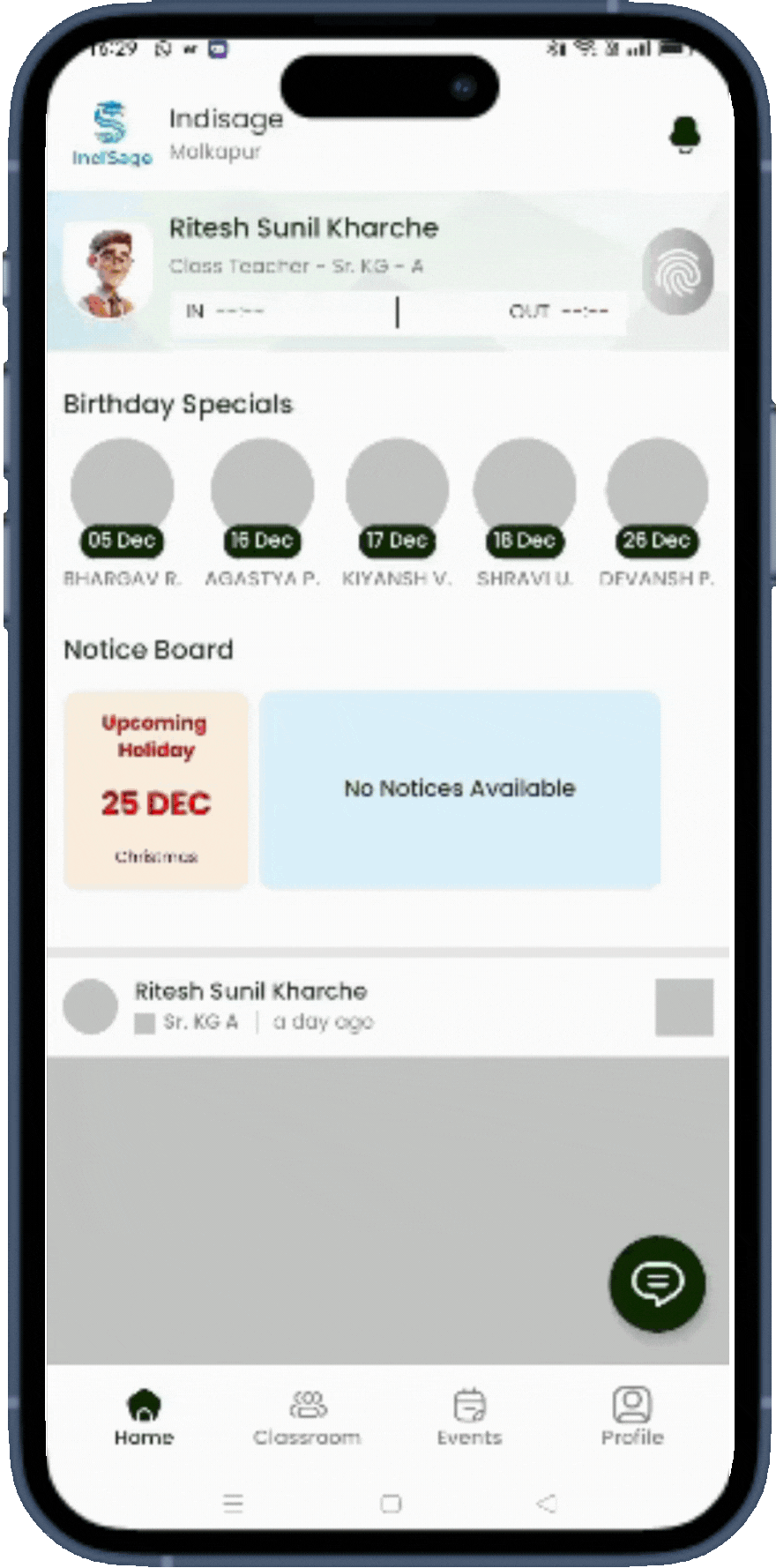 Enable seamless teacher attendance tracking directly from the home screen. With the “Mark In” and “Mark Out” options, teachers can record their arrival and departure times effortlessly. This feature ensures accurate attendance logging, supports efficient record-keeping, and promotes accountability, all while simplifying the daily workflow for educators.